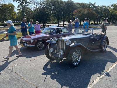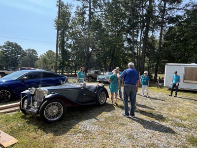 September 6, 2025 - Mina and I led the Tidewater Region AACA run to Sam Kern's today, something of a surprise. Happily, I have been there once before, so I had a reasonable idea of how to get to his place on Gwynn's Island. We met at the Hampton Coliseum parking lot and took I-64 and Route 17. Mina was only the SECOND oldest car, with Dave and Faye Curl driving their 1930 Model A Ford! Best Bud Chip rode out with me in the TC, but went back with sister Jennifer and girlfriend Julia in a much more comfy new car. Mina did great, as expected, and we all had a nice drive. The total for me and Mina was over 140 miles! |