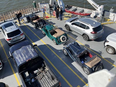 October 3, 2025 - A last-minute decision to take part in a Williamsburg T Club outing (I've been a member for years, but they are usually too far away) turned out to be a great run that included a ride on the Scotland Neck Ferry and lunch at the Smithfield Inn. The Williamsburg group was terrific, and very welcoming. We had one other TC, two TDs, and a TF on the run, which toured back roads with almost no traffic. Mina and I ended up driving about 120 miles total. She was great right up until I got ready to leave for home from the restaurant. The battery would not crank the car over enough to start. Happily, if a bit embarrassingly, I got a push start from three of the club members. I might have made it home, but decided to buy a battery on the way that will work for both the TCs and my two side-post GM cars. The alternator is showing 14+ volts on its gauge, but the car's voltmeter just registers a discharge. Time to figure out the electrics! |