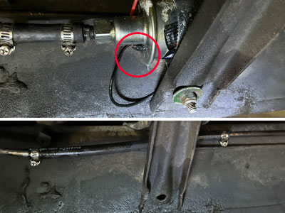 | April 24, 2025 - Another Leak! - I noticed another wet spot under the Thunderbird tonight and thought the coolant was leaking again. Nope - I looked underneath and saw fuel dripping from the electric pump I put in as a booster and haven't really used since I found the hard-starting was due to the choke being stuck open. After tightening the clamps at both ends, I traced the leak to the pump itself - an internal hemorrhage that let fuel run out the electrical wire grommet. The pump was removed, but the fuel kept coming out, which probably means the tank has lost a lot since I filled it up a couple of weeks ago. Better to find the issue now than when I take it to the Old Dominion Meet in a few weeks! |