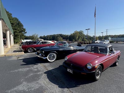 | November 16, 2024 - Leader of the Pack - I led the group on our car club's annual Square Car Tour today, and was lucky in a number of ways. I had planned to take the Nash, forgetting that the MGB-GT was up on ramps outside blocking the main garage door. Then both expected passengers dropped out, so I was able to drive the Thunderbird. Bill Treadwell, current TRAACA President, chose to be my navigator, and other than one missed turn that was easy to adjust for, the group of more than 15 old cars did great. Note the black 1978 Thunderbird behind the 1956 - you can see why the original 2-seaters were called 'Baby Birds.' Alas, changing weather means this is likely to be my last outing with the hardtop off until Spring! |