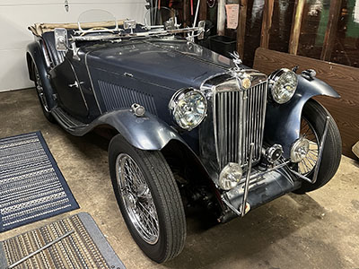 February 17, 2023 - A friend from the car club told me about an MG TC he'd been asked about - inherited and now being sold. I went along for his first look last night and fell in love. Granted, to paraphrase the famed Will Rogers, 'I never met a car I didn't like.' The car was obviously driven and set up for fun - it has quite a few modifications. The biggest of these are a 5-speed Nissan gearbox, and a Nissan steering box. It also has been converted to an alternator, and has 8" tripod headlights. The engine cowl/firewall is covered in engraved plaques detailing the electrical system, how to adjust carburetors, etc. Although the paint is awful, the actual structure seems really solid and the rebuilt original engine runs smooth and has strong oil pressure. There are also spare parts that include another chrome wire wheel and tire, a hand crank, and a car cover. I'll be picking the car and parts up on Sunday - more details afterwards! |