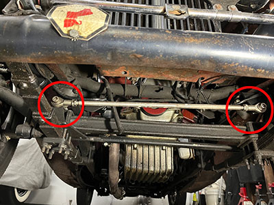 | February 24, 2023 - A couple of discoveries today - first of all, the TC has a Panhard rod installed on the front springs. The LH bracket mounts on the chassis; on a TC it is held by the four bump-stop bolts. The RH bracket mounts on the front spring where it bolts to the axle beam, and replaces the existing bracket (which also carries the shock absorber link). This mod. prevents the axle from moving when you turn into a corner. The other discovery was puzzling - the positive lead (power) of the battery was not connected! It has been sitting on top of the post, yet I have had no trouble cranking or running the TC! Secured now. I still haven't determined why the driving lights have quit working - no sign of a break in the wiring, and the fuse and bulbs appear good. Still, it almost has to be something pulled loose when I installed the nerf bumpers. | ![]() |