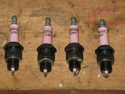 May 18, 2009 - The engine compartment is pretty much done now - I repainted the generator, rerouted and shortened the coil wire, installed the correct gas line clamp on the firewall, and installed a set of period British Lodge spark plugs (at left). The pink porcelain and black bases are unique to the Lodge plugs - these are NOS off of eBay. Just have the two rear side curtains to finish up, and then a last go round of touchup, cleaning and polishing. Just found out I will be in Seattle for THREE days next week - aaarrg! I usually never travel for the company - figures they would pick the week I have the big show to send me to the other side of the country! Oh, well. The car should be ready to go. |