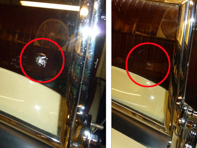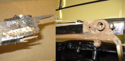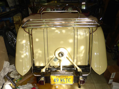 | May 17, 2009 - Things are coming together now. As you can see, the end panel chrome (top) was pretty bad - the new pieces (bottom) got painted yesterday by Mike and came out really nice. Getting the old ones off was a snap, but installing the new ones was a test of patience. There is just about enough room for two of my fingers between the fender and gas tank to work the bottom bolts back on. Took about a half hour each, but the panels are on, and the back end is touched up and back together. I started overhauling the side curtains, stripping them to the bare frames and repainting them the correct dark tan. The fronts are done now with all new stainless trim and hardware. Just the back ones left. I also pulled and repainted the generator, which had thick, rough paint that had to be stripped with a wire brush. I have weeknights this week to finish the back side curtains and get the chassis touched up. Naturally, my company is sending me on a short-notice trip to Seattle Memorial Day weekend, so I will be losing some of the prep time I was counting on. Oh, well - gonna make it anyway! | ![]() |