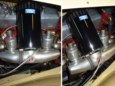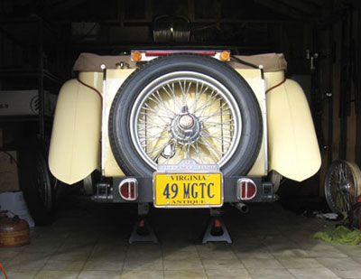 | September 10, 2016 - Idle Gossip - The TC has had a very high idle for a long time now that did not respond to adjustments of the carburetor or hauling back on the gas pedal. Which indicated an air leak at the carbs. Best Bud and SU Guru Chip came over and supervised as I went searching and we found the culprit(s). The carb base bolts had no washers (I think from the factory) and had dug into the carb bases enough create some small leaks, and the bottom bolt on the rear carb was loose enough to allow some carb wiggle when the top bolt was removed. I added stainless steel flat and lock washers to all four bolts, tightened things down, and now have a nice, steady 800 RPM idle! I also got the rear wheels and fender wells cleaned up, along with the spare and gas tank straps. Just need to get the new tire mounted for the right front and finish cleanup before next Sunday's Classics on the Green Show in New Kent, VA. | ![]() |