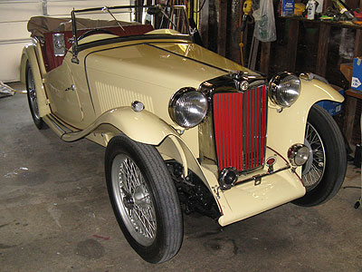| March 5, 2009 - Got the new bolt in from Moss yesterday, and installed it last night. However, an MG Car Club meeting kept me from working on the car until tonight. I cleaned out the fuel lines and also cleaned and checked the points. Then I took a deep breath and pulled the starter knob. She sputtered a little, and it took a few tries, but she finally caught on her own and smoothed out with no smoke, no leaks, and 50 pounds of oil pressure at warm idle. She has a miss that is probably due to misadjusted valves, which I will take care of. tonight. You can see and hear her run by CLICKING HERE. I haven't taken her out of the garage yet, but the clutch felt smooth and the transmission snicked nicely into all gears - the brakes held when I let the clutch out. All I need now are brakes lights! WOO-HOO!!! |
