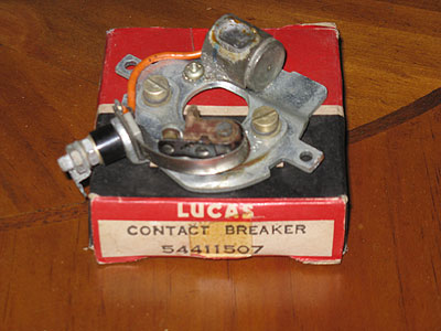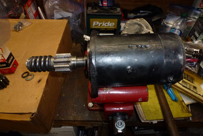 | January 22, 2018 - A Start on the Starter - The new pinion assembly came in in the original Lucas box (above left picture. You can see by the inset that the old pinion gear was pretty badly chewed up. After some checking back and forth between the spare starter and what I had assembled, I had Wildflower's starter back together and ready to install (right). I set about getting it back in place. Thirty minutes later I was no closer to getting it in and was saying bad words. (Yes, even worse than 'Triumph'!) It took just the right angle to get the starter out, and I will have rediscover that angle to get it back in. Not tonight, though. I have cleaned up and am going to give it another shot later this week. | |