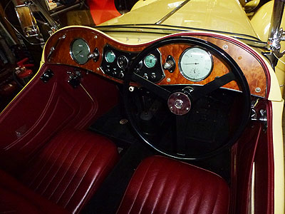| March 28, 2009 - Yesterday proved to be a bonanza - I came home to find a pile of packages on the front porch that included everything I was waiting for, including items not due until Tuesday! The most important of these was the Hidem strip to finish off the top, though I was also glad to see the restored original steering wheel and correct NOS headlight lenses and rims. While putting on the snaps earlier this week, a friend who is a professional upholsterer had mentioned the top needed to be tightened up. Richard returned for second fitting today. We were able to pull another inch or more across the entire top and improved the fit a great deal. The result is a huge improvement over the original and badly worn white vinyl top that had been reinstalled using about a thousand staples through the rear cover strip. The top windows are not quite right, being higher and more rectangular than the actual TC dual windows were, but they are far more useful for a 6'1" driver like me. In any case, the top is going to be down 99% of the time. The headlights will have to wait, as I didn't get some expected retainer clips with the lenses and rims - no biggie - the Lucas P700s were available for the TCs. Pretty much down to detailing and chassis touch-up now. Cutting things close, as we leave Thursday. Hard to believe the car wasn't even mine two months ago! | |