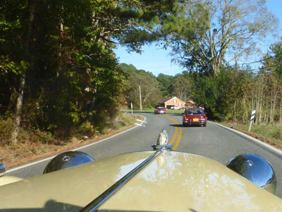| October 29, 2016 - Fun Run - Some friends and I took advantage of today's beautiful clear skies and mild temperatures for an old car fun run to Coinjock NC and back. Richard and Sandy Hall led the way in their MGB-GT, with Terry and Sue Bond in their near-twin MGB-GT, me in Wildflower (49 MG TC), and Hillary and Jack Pavlidis in the 1967 Mercury Cougar that used to be Wildflower's stable-mate. It was a fun drive, with great food at the Coinjock Marina. On the way back, Wildflower started weaving and I stopped to discover that the left rear tire was flat. It was easy to change out, and we finished up with no further incidents. I found out that the tire had slipped on the chrome rim and torn the valve stem off - too much torque from the 54.5 HP 4-cylinder engine! All fixed now with a metal-stemmed motorcycle tube. | ![]() |