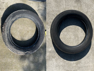 September 13, 2016 - Re-tired - Thanks to a solid front axle, extreme toe-in, and possible damage in the distant past, the TC eats front tires up pretty quickly. Granted, I've put close to 7,000 miles on the car, but that's three left front and two right front tires. Bias ply doesn't last like radials, of course. At least I can do the job myself in such a way the chrome wheel doesn't get scratched and the tube doesn't get pinched. The right front tire had worn down almost to the casing in the center - it started out just like the new tire in front. |