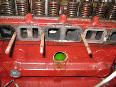 | March 1, 2009 - The valve train is assembled and in place, but one of the 8mm bolts stripped as I was torqueing it down - I'll look for one at the local hardware stores, and if I can't find it, order one tomorrow. The rest of the bolts, including the head bolts, are all torqued down and ready. I did discover that the new bolts from Moss are just a tad longer - enough to bottom out just before they tighten. I solved the issue by installing hardened flat washers under the lock tabs - that made the difference. The valve adjustment looks good, and I installed some new spark plugs. A big can of high test is ready to dump in, and the tank is closed up. Once I get the bolt in place, I'll finish up with the fuel system and see if she will start. |