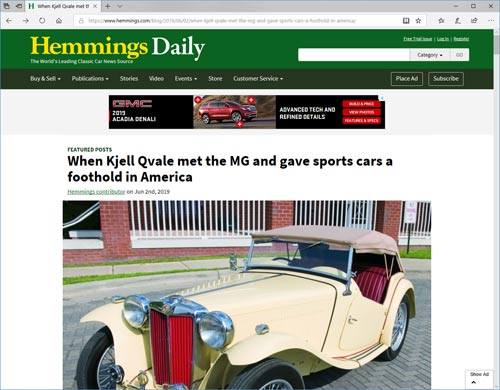 July 4, 2019 - Hemmings Again! - During a search for TC information, I came across this July 2 Hemmings online article that features photos of Wildflower! I even took one of the images! Glad that they recognize what a beautiful example she is! The article is at: https://www.hemmings.com/blog/2019/06/02/when-kjell-qvale-met-the-mg-and-gave-sports-cars-a-foothold-in-america/ |