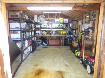 | July 23, 2017 - Housecleaning - Wildflower's garage had started leaking a bit on the sides (not on her) so i had to get the roof replaced. It turned out there was no tar paper under the shingles, and after 19 years water found a way in. I ended up having to replace most of the wood, choosing 3/4 inch exterior plywood instead of the particle board that had gone bad. That was topped off with roofing paper and 30-year shingles. With the leaks fixed, I completely emptied the garage out, scrubbed the floor, and started over. In addition to adding a new rack of shelving for parts boxes, I put up some of Wildflower's art and automobilia. The garage is now dry, clean, and much nicer looking. | |