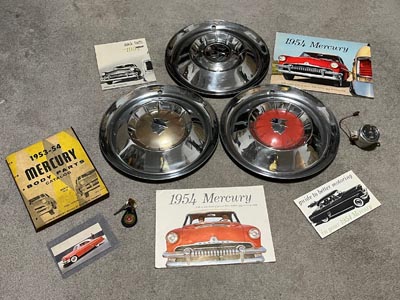 | March 23, 2026 - You can pretty much tell what my latest vehicle is by packages from eBay. Clockwise from left to right, I have a porcelain emblem keychain, a dealer postcard. a 1953-54 Body Part Catalogue, a 'Quick Facts' dealer brochure, a 1955 wheel cover (bought by mistake), a deluxe showroom sales catalogue, a dashboard clock, and a 1954 Mercury sales folder, around two 1954 Mercury wheel covers. Note the only difference between the 1954 and 1955 wheel covers is the ring around the emblem in the middle, which is covered by the fenderskirts, so I can use it anyway. New tires are due in tomorrow, which should solve the vibration issue. And I have a rebuilt fuel pump and an NOS one coming, as well as a rebuild kit. |