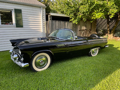 | July 23, 2024 - Giving Myself the Bird! Usually not within reach, but always desired, the 1956 Thunderbird has an iconic look with the continental kit and fender skirts. A friend in the old car club bought this in 2012 from someone who purchased the car in 1961. Black, with black hardtop and black/white interior, the car is visually very striking. It has a long list of options, including the highest-output (225 HP) engine, automatic, and power steering and brakes. When he said he wanted to sell the car, I had to scramble first to see if I could come up with garage space, and then to see if I could come up with the purchase price. With both initial conditions met, friend Dan went with me to look at and test drive the car. While it has a few cosmetic flaws, the car is rust-free and both looks and drives really nicely. My only question was if I could fit (OK to drive, but getting in and out is a challenge) and how the car drove. As it turned out, getting in and out is currently a bit difficult, but that can be helped by a smaller steering wheel, which is available. However, driving is not a problem, and the Thunderbird did great on the long drive back from Kitty Hawk. Good temp, oil pressure, no sway or wandering, no odd vibrations. Better yet, I was able to get to DMV and have the car titled, tagged, and insured! | |