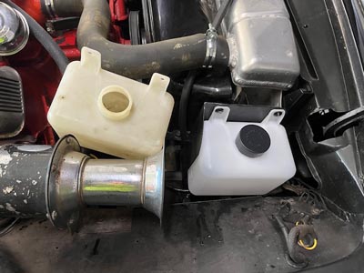 November 25, 2025 - Matched!- The Thunderbird has been losing coolant, so it was no surprise when the overflow bottle was empty this morning. I have not found any leaks in the cooling system up to now, but got a clear indication when the coolant started running out of the overflow bottle at the bottom. Turns out the connector to the radiator was mostly broken off. I actually found the exact overflow bottle at O'Reilly's and replaced the bad one. A test drive showed no further leakage, so I have probably found the issue. |